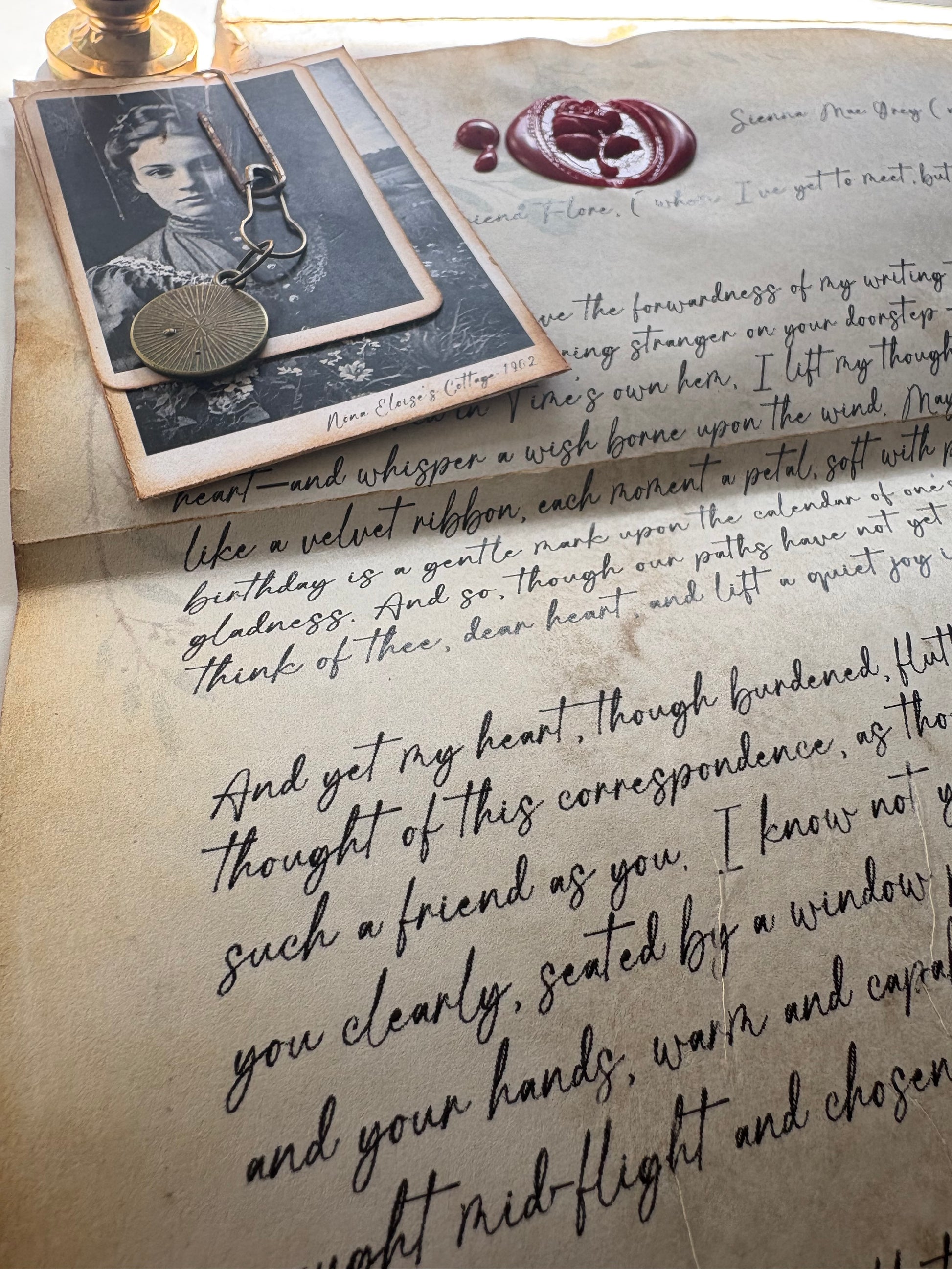 All characters, stories, and events in these letters are entirely fictional. However, every effort is made to craft each one with historical charm, poetic detail, and authentic touches—so that receiving a letter from Sienna Mae feels as though it truly arrived from the early 1900s. From aged paper to vintage language, every element is designed to transport you to another time.